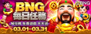通博- BNG每日任務 優惠時間 2021/3/1~3/31 優惠內容 適用遊戲: 好運金財神 – 集鴻運、皇朝盛世-集鴻運、大三元 – 集鴻運、荷魯斯之眼